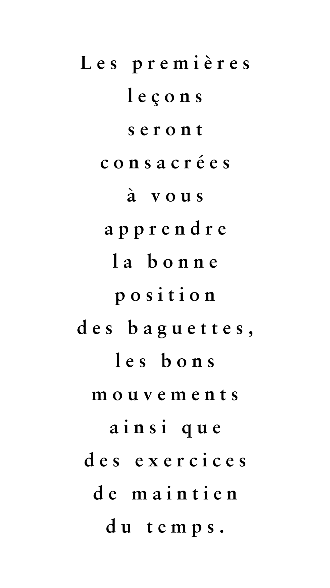 Les premières leçons seront consacrées à vous apprendre la bonne position des baguettes, les bons mouvements ainsi que des exercices de maintien du temps.
