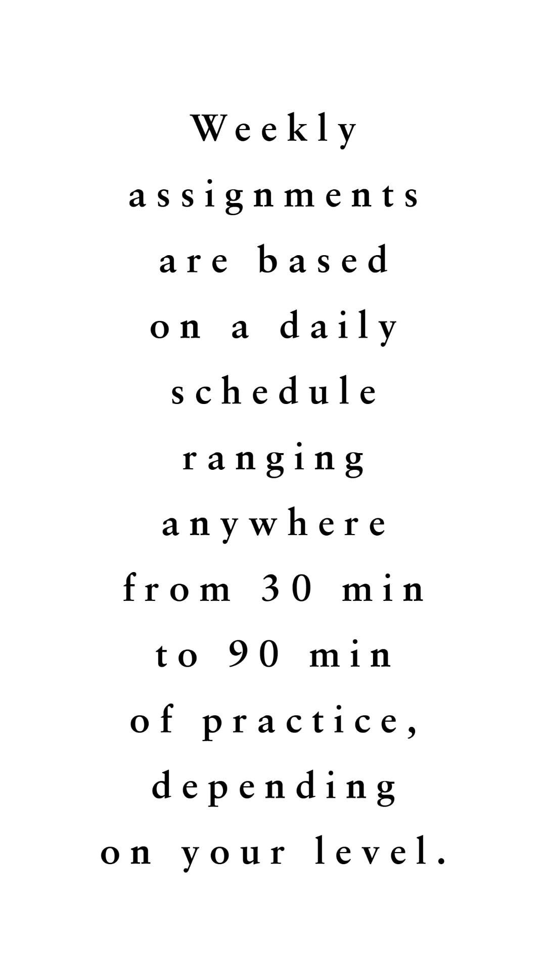 Weekly assignments are based on a daily schedule ranging anywhere from 30 min to 90 min of practice, depending on your level.