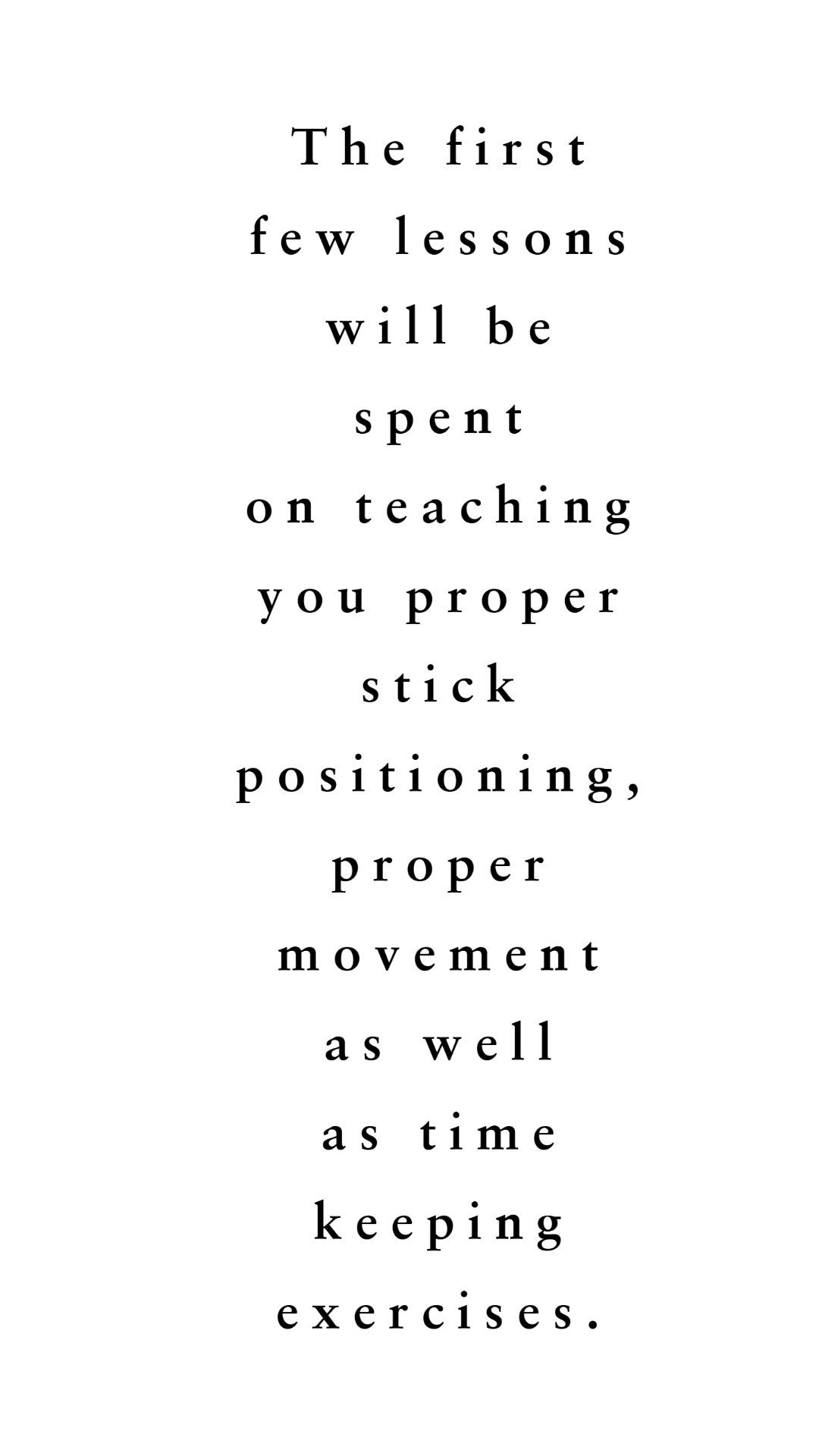 The first few lessons will be spent on teaching you proper stick positioning, proper movement as well as time keeping exercises.