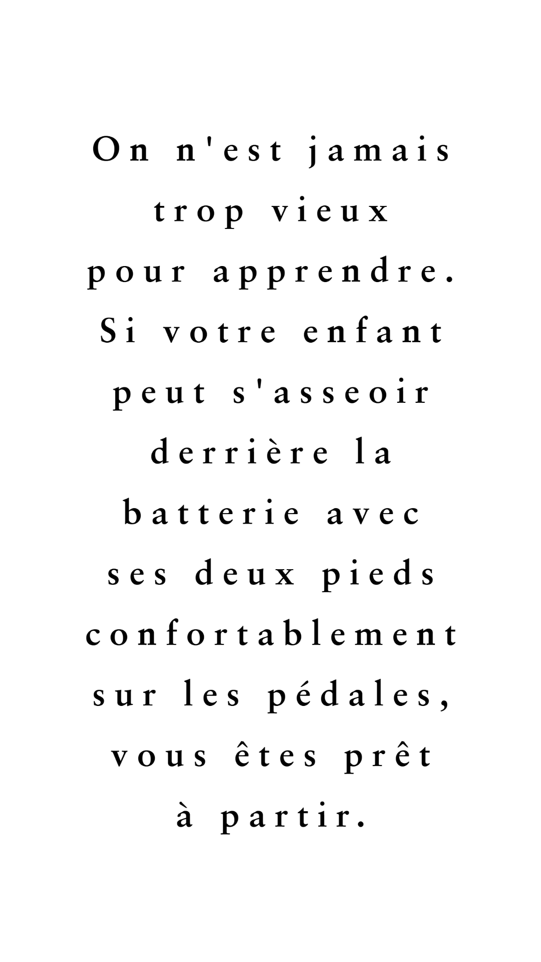 On n'est jamais trop vieux pour apprendre. Si votre enfant peut s'asseoir derrière la batterie avec ses deux pieds confortablement sur les pédales, vous êtes prêt à partir.