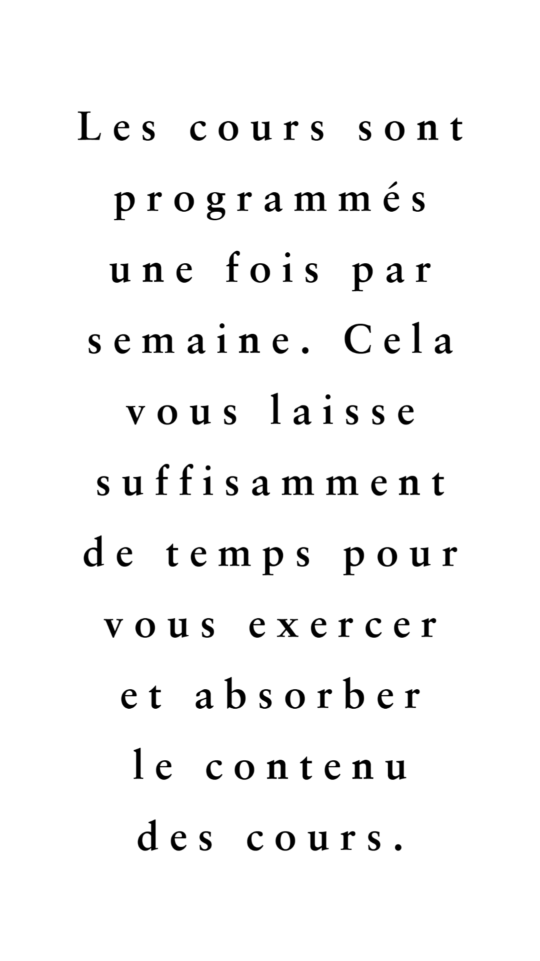 Les cours sont programmés une fois par semaine. Cela vous laisse suffisamment de temps pour vous exercer et absorber le contenu des cours.